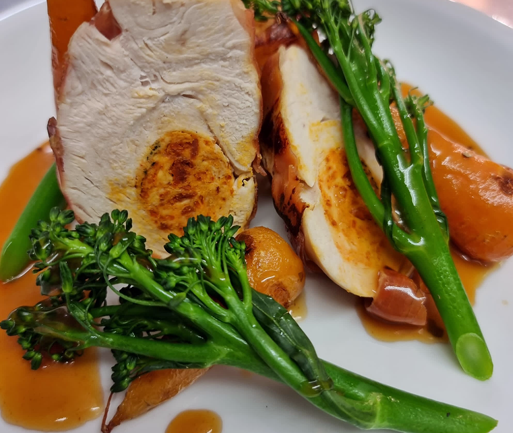 Roasted loin of Pork with wholegrain mustard new potatoes, apricot stuffing, parsnip puree, broccoli, crackling and a cider jus